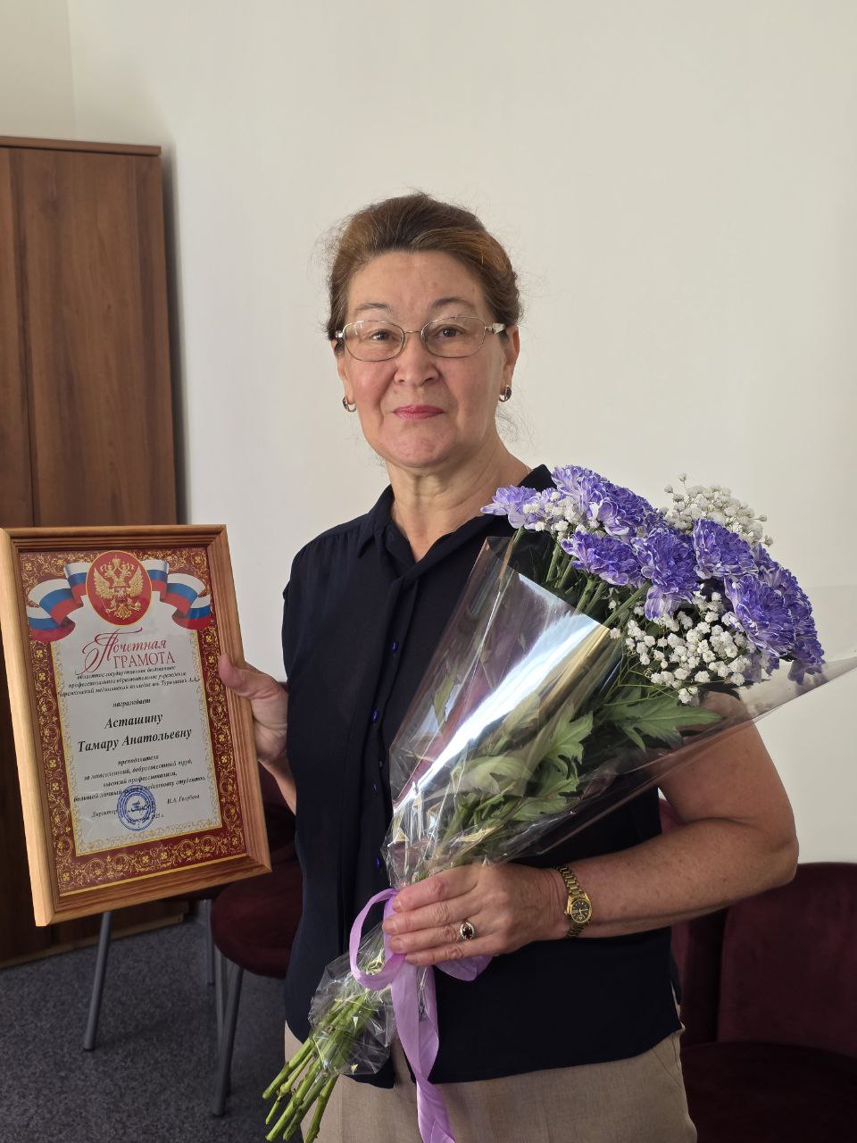 Уважаемая Тамара Анатольевна! Позвольте от всей души, с глубоким уважением выразить безграничную благодарность за достойный труд, профессиональное мастерство, превосходные человеческие качества! Низкий Вам поклон за ответственную работу и вклад в общее дело. Желаем благополучия, здоровья Вам и Вашим близким — теперь у Вас появится возможность проводить с ними больше времени. Искренне хотим пожелать Вам такого же замечательного отдыха, как Ваша безукоризненная трудовая деятельность. Интересных и счастливых событий !